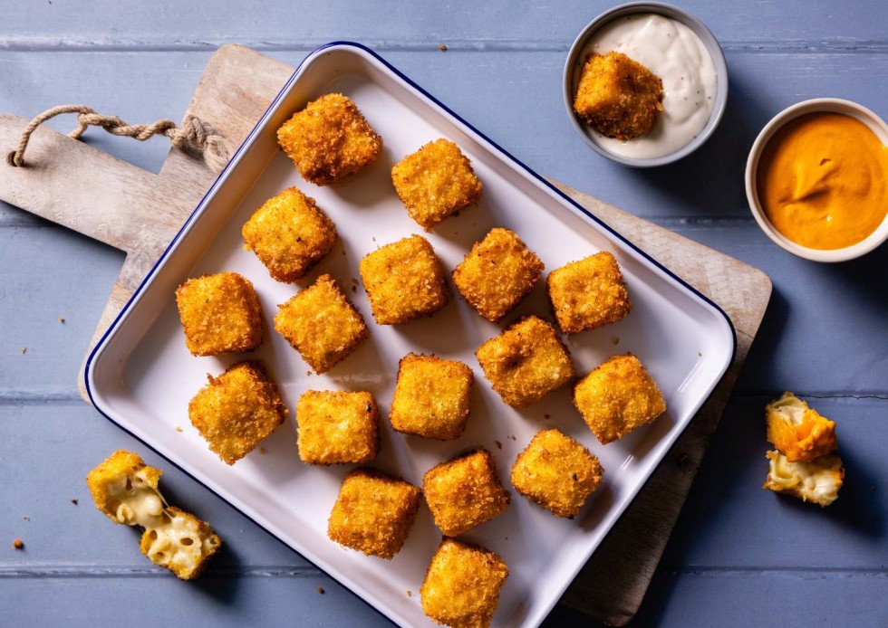 When ready to cook, heat oil to 165°C. Remove the set macaroni from the tin and cut into small squares, about 7 x 8 pieces.
